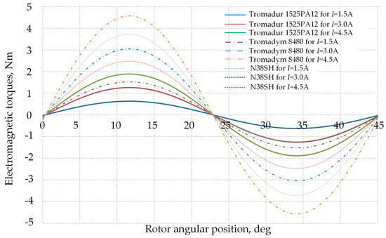The comparison of the electromagnetic torque characteristics versus rotor angular position for rotor made of Tromadym 8480, Tromadur 1525 PA12 and N38SH materials.