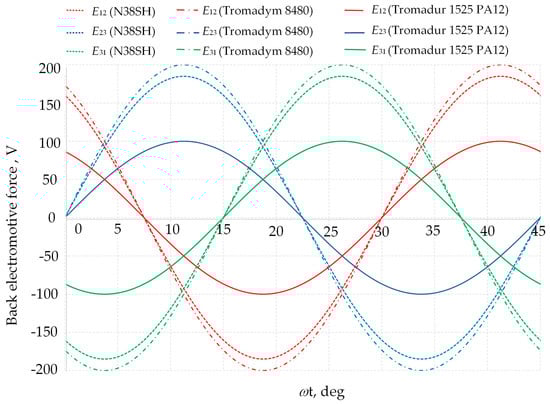 Comparison of waveforms of the line-to-line beck electromotive force (BEMF) for the rotor made of materials Tromadym 8480, Tromadur 1525 PA12 and N38SH, where ω = 225.15 rad/s.