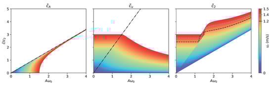 Evolution of the different contributions, as defined in Equation (9), for the effective damping of the structure expressed with respect to the true damping coefficient, . In the left panel, the amplitude-dependent term, , with the limit defined by Equation (18) included as dashed-dotted line. In the centre panel, the external velocity-dependent contribution, , with the limit defined by Equation (15) for indicated as dashed-dotted line. In the right panel, the total effective damping, obtained as a superposition of the two contributions from the previous panels. In this case, the dashed lines are included for two particular values of m/s and m/s.