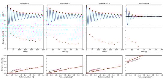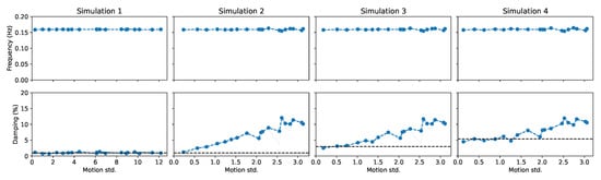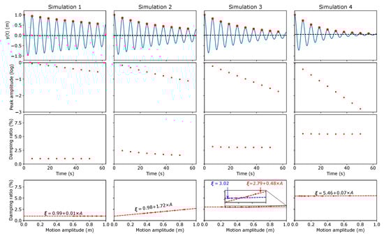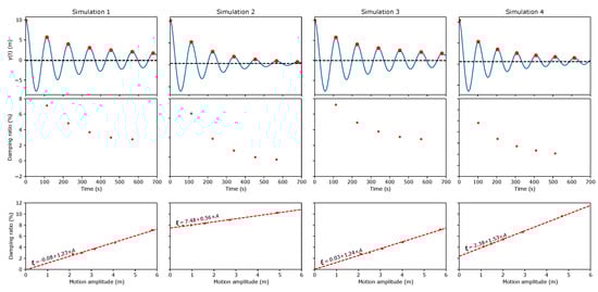 Additionally, the constant and stable values found in all simulations for the damping ratio may come as a hint that the induced motion amplitudes are mostly falling below the threshold previously identified. To test this hypothesis, the response was simulated for different intensities of white-noise loading. The evolution of the identified damping ratio with the characteristic motion amplitude, as defined by its standard deviation, is presented in Figure 6. The motion amplitude was used rather than the white-noise characteristic value, since it is expected to be more closely related to the identified damping ratio. As can be seen, while Simulation 1’s predictions are stable for arbitrary conditions, as expected, Simulation 2 to 4 exhibit a clear dependency on the intensity of the external loading. In fact, it can be seen that there is a given characteristic motion amplitude that separates a region where the identified damping is constant from a region where it increases with the motion amplitude. Additionally, it can be seen that the point at which this transition is found is closely related to the reference environmental speed, , of the corresponding simulation: in Simulation 2, and the amplitude dependence is found for all simulated conditions, in Simulation 3 and 4, with , a constant damping coefficient is found for motion amplitudes ∼, increasing after that threshold (note that the theoretical prediction is found at , but here, , and A is closely related with the motion’s standard deviation).
