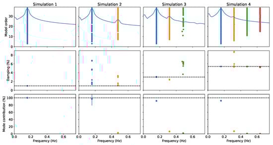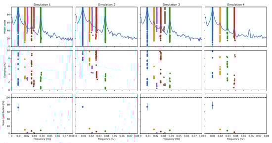 Once more, the same results could be estimated using the SSI-COV and the results are presented, for reference, for the surge motion in Figure 10, where the presence of the fundamental frequency harmonics is easily identified. This is important because it unveils that this effect can be used to identify nonlinear contributions that could be otherwise interpreted as independent modes. It may also be seen that the identified damping levels exhibit a significant scatter, except for Simulation 2. This can be understood, since the case with the external sea current is the one where the damping level is dominated by the amplitude-independent terms. In all other cases, there is a pronounced dependence on the motion amplitude, and this is perceived as different damping levels in the stabilisation diagrams. In fact, and referring back to Figure 8, it may be seen that the scatter is compatible with the maximum and minimum damping levels identified in the logarithmic decay analysis.