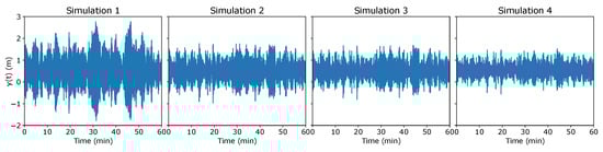 If the issues above could raise the question of whether or not to use the SSI-COV, the fact is that the free decays that have been used as a direct input for the identification method are not compatible with the more commonly available experimental data. To emulate this situation, the single-degree-of-freedom model was excited with a white-noise external action for 4000 s. The generated time series after removing the first 400 s to ensure that the transient events were properly faded away are presented in Figure 4. The results of the SSI-COV method are presented in Figure 5, where 30 s was used for the length of the correlation function estimates. Once more, it can be seen that in all cases, the estimated damping coefficient is in accordance with the values obtained for the free decay, but different for different environmental conditions (note that all simulations were conducted with the same structural properties). Additionally, while Simulations 1, 3 and 4 recover the expected theoretical values, Simulation 2, where the amplitude dependence of the response was more pronounced, exhibits a higher scatter in the damping estimates. In all cases but Simulation 1, it should be noted that the identified value is not a direct estimate of the damping coefficient.
