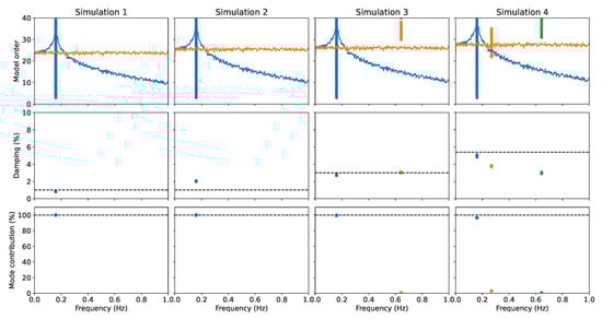The free decays for the different simulations were used as input to the SSI-COV algorithm, and the results obtained are presented in Figure 3, where a reference value based on the free decay results just described has also been included for reference as a dashed line, based on the different limits that are adequate for each simulation. Here, and in the following, the SSI-COV results are presented as stabilisation diagrams: the first row includes the different stable poles (a pole is considered stable if the frequency and damping variation between model orders is not higher than 1% and 10%, respectively) identified for different model orders, with the corresponding damping level and the relative contribution for the total response presented on the second and third row, respectively. The poles were separated in different clusters with DBSCAN [26] using as metric the differences in the frequency, damping and modal contribution. It is interesting to note that while the results from Simulation 1 trivially recover the theoretical values, the remaining simulations exhibit different properties. In fact, it can be seen that Simulation 2, where the environmental velocity vanishes, corresponds to the cases where the identification is harder and exhibits significant scatter. On the other hand, as the environmental velocity increases, the natural frequency identification is easily recovered, but different harmonics are also found. These harmonics, due to the nonlinear components of the model, are also partially visible in Simulation 2.