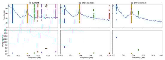 Note that the chosen conditions ensured that the standard deviation of the wind time series was the same in wind field 2 and wind field 3. All conditions were combined with different sea current velocities between 0 and 50 cm/s, for a total of 33 independent simulations. The stabilisation diagrams for the minimum and maximum current speeds considered, as well as an intermediate case, are presented in Figure 11 for wind field 1. As can be seen, the damping level associated with the surge motion seems to increase with the speed of the current, while the same does not seem to happen for the pitch motion.