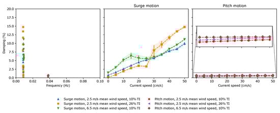 Evolution of the damping ratio as a function of the current speed and the wind field properties for surge and pitch motions. On the left panel are presented the stable poles’ damping and frequency values obtained for the relevant motions and all the setups.