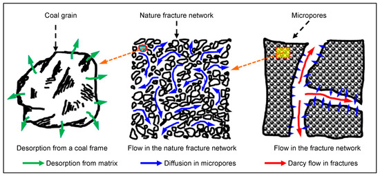 Figure 2. Desorption diffusion and Darcy flow in physical models. - The flow in the natural fracture system is called Darcy seepage (Figure 2).