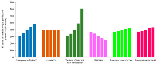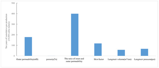 In the process of CBM development, the productivity evaluation of a single well involves the whole production process. A single-well productivity evaluation is also an important element in block development planning and design. The productivity of coalbed methane is affected by many factors in the process of production. The typical influencing factors in this model are the original permeability of a gas reservoir, the original porosity of a gas reservoir, the ratio of inner and outer permeability, skin factor, Langmuir volume and Langmuir pressure. According to the statistics of gas reservoir parameters of most fractured vertical wells in the Panhe Block, the value range of each parameter in the sensitivity analysis is determined (Table 4). The sensitivity of the influence of each parameter on the productivity of a single well is studied by using the ten-year cumulative production as the representation index of the productivity of a gas well.