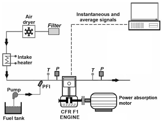 The main modification made on the engine was the removal of the original four-bowl carburetor assembly and the installation of four electronically controlled Bosch 0280150712 (Bosch, Gerlingen, Germany) fuel injectors installed in the engine’s intake runner. In addition, the original power absorption electric motor was substituted with a Lönne 14BG 206-2AA60-Z motor (Lönne, Kaunas, Lithuania), which was used to start the engine, absorb the power output of the engine and maintain constant engine speed). The modified setup also included a Leister LE 3000 (Leister, Solingen, Germany) intake air heater mounted on the intake manifold. To measure fuel consumption, a Sartorius CPA62025 (Sartorius, Göttingen, Germany) scale was used. The in-cylinder pressure trace was measured with a water-cooled Kistler Type 7061B piezoelectric pressure transducer (Kistler, Winterthur, Switzerland) mounted in the cylinder head and connected to a Kistler Type 5011 change amplifier (Kistler, Winterthur, Switzerland). This transducer was mounted in the same hole normally used by the D-1 Detonation Pickup, the pressure sensor used by the engine in its original configuration. Crankshaft position was measured by a Leine & Linde RSI 503 22990963-06 shaft encoder (Leine & Linde, Strängnäs, Sweden), with a resolution of 1800 pulses per revolution (0.2 crank angle degrees). The relative air–fuel ratio (lambda) was measured by a Bosch UEGO (universal exhaust–gas oxygen) sensor mounted in the exhaust pipe and coupled to an ETAS LA4 Lambda Meter. The engine was controlled, and the several test variables were recorded by a custom-built LabVIEW 2011 program.