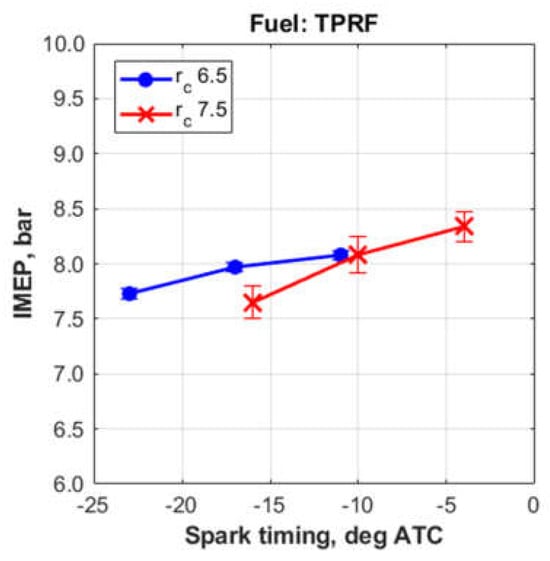 In this section, the main experimental results are presented and discussed. Due to the large amount of data that were produced and due to space limitations, only a part of all results, corresponding to just one spark timing and one compression ratio, is considered. The choice of these two engine parameters was based on the combustion phasing and the corresponding engine efficiency obtained with the gasoline surrogate (TPRF) baseline fuel. The chosen spark timing was determined based on the peak thermal efficiencies, as the following plots show. The plots below show how the spark timings and the compression ratios affected engine performance, as represented by the CA50 angle, the indicated thermal efficiency (ITE), and the indicated mean effective pressure. For the indicated results, the error bars in the plots represent the standard deviation of the measured values corresponding to 1000 engine cycles.