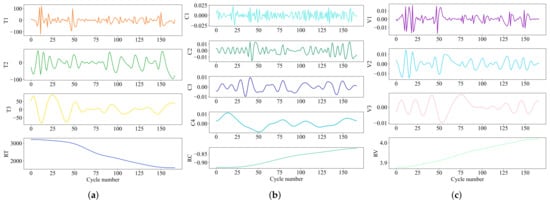 - Utilizing the CEEMDAN algorithm to decompose HI, each decomposition results in several modal components and a residual component, reflecting the overall trend. Decomposing HI can decouple the trend component of overall change and the oscillation component of capacity regeneration, effectively suppressing regeneration phenomena in the sequence, and improving prediction accuracy.