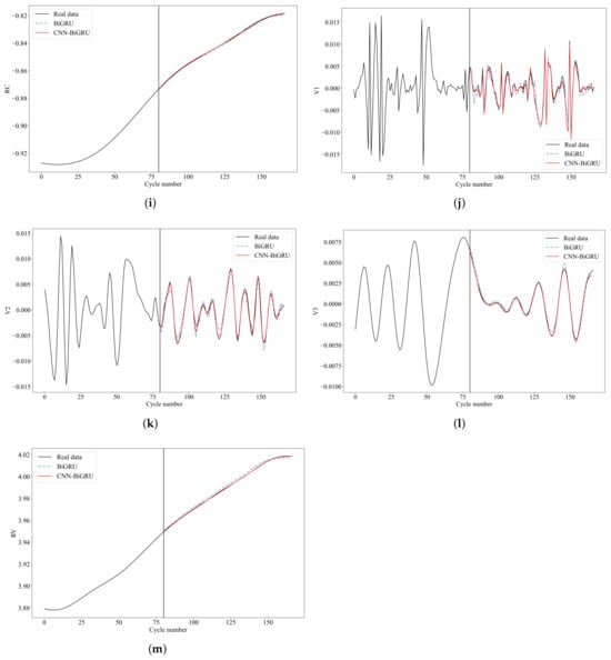 - Establishing a CNN-BiGRU capacity prediction model. Using the extracted HI as multi-dimensional feature input and the corresponding battery capacity as a single-dimensional feature output, all HI and battery capacity data are divided into training and testing sets based on the ST. The capacity prediction model is trained, and finally, the component prediction results from the previous step are integrated to obtain HI as input. The model output is the predicted lithium-ion battery capacity, and the battery RUL prediction result can be calculated based on the set failure threshold.