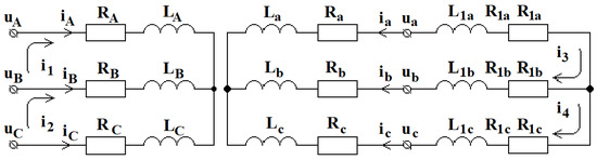 where and are the inductances of the phases of the primary and secondary windings; LAB and LBA, LBC and LCB, and LCA and LAC are the mutual inductances between the phases of the primary winding; and Lab and Lba, Lbc and Lcb, and Lca and Lac are the mutual inductances between the phases of the secondary winding. Moreover, ; ; ; ; ; ; ; ; and LCc and LcC are the mutual inductances between the phases of the primary and secondary windings.