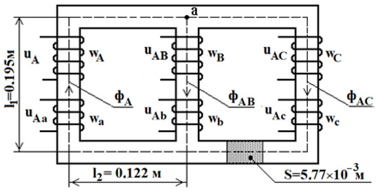 Following [18], the inductances of the primary and secondary windings of a transformer are determined by the values of the magnetic fluxes ϕA, ϕB, and ϕc in the core legs. The inductance of a winding is proportional to the squared number of turns of the winding.