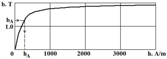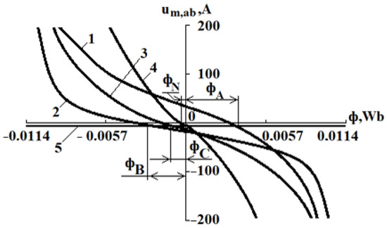 First, following [18,19], the positive direction of all of these magnetic fluxes is chosen. In Figure 1, they are directed from node a to node b. After that, the dependences , , , and are plotted, where , , , and are the magnetic voltages in the branches of phases A, B, and C and the branch N where is closed. To plot, for example, the dependence , a series of numerical values of the magnetic flux are specified. Then, the magnetic field induction in the branch of phase A is found for each value as follows: