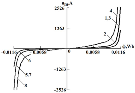The magnetic voltage, , is calculated for each value from the magnetic flux series in the same way, and the dependence, , is plotted based on the calculation results (curve 1 in Figure 5). The curves and are plotted in the same way (curves 2 and 3). The curves and coincide in Figure 5 because of the same path lengths of the magnetic fluxes and .
