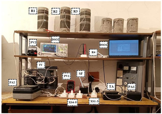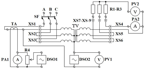 Experimental setup: experimental TT-6 transformer (TV); 2.5–10-ohm variable load resistors (R1, R2, and R3); AP50 circuit breaker (SF); UNI-T UT101 and YX-360TRD voltmeter (PV1 and PV2); I54/1 measuring current transformer (TA); E59 and D566 ammeter (PA1 and PA2); laptop-based digital oscilloscope with ELENA-2014 software (DSO1); high-ohm resistor (R4); RIGOL DS1054Z digital oscilloscope (DSO2); Schneider Electric socket-outlet (XS1–S9).