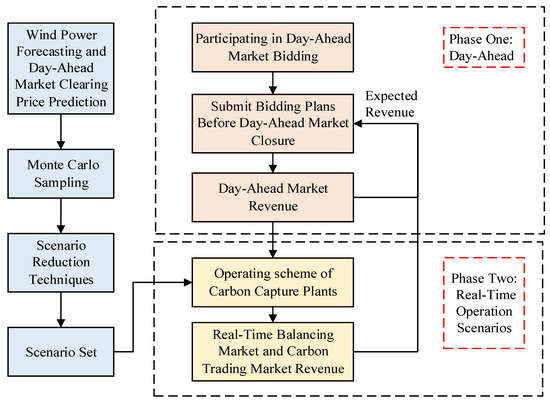 The two-stage decision-making framework is illustrated in Figure 2; the uncertainties of clearing prices and wind power output are modeled via a set of scenarios. Assume that the forecast errors of random variables follow a normal distribution, and the scenarios are generated via random sampling from the probability distribution. Subsequently, a Kantorovich distance-based scenario reduction technique is utilized to establish a set of typical scenarios and their corresponding probabilities. The bidding strategy aims to maximize expected profits and minimize risk as multi-objectives. The risk aversion coefficient is determined based on the risk tolerance levels of generators. The optimal solution is calculated by combining all scenarios along with their respective probabilities. The wind power uncertainty is described through scenarios where the CCPP adjusts its actual net power output based on wind power variations within each scenario.