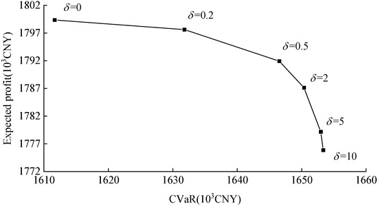 This section explores the expected profits and CVaR values under different risk aversion coefficients, with δ values ranging from 0 to 10. Figure 4 illustrates the efficient frontier curve of CVaR, where a δ value of 0 represents a risk-neutral attitude, focusing solely on maximizing bidding profits. It is observed that the joint bidding strategy, when not considering risk, achieves a maximum expected profit of CNY 1799.4 thousand, which is CNY 23.5 thousand higher than the strong risk-averse joint bidding strategy (δ is 10). The purpose of risk aversion is to reduce the expected profit gap between different scenarios by sacrificing economic benefits. Hence, the resulting CVaR value when δ is 10 is CNY 1653.3 thousand, which is an increase of CNY 41.7 thousand compared to the situation when δ is 0.
