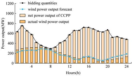 The power generation alliance needs to strategically determine its power output based on the bidding quantities and day-ahead clearing price. Figure 5 illustrates the actual power output of the wind farm and CCPP. Between hours 1 to 6, in cases where wind power output exceeds its forecast, the CCPP minimizes wind power curtailment by reducing its net power output. The carbon capture system can serve as a dispatchable load. From hours 5 to 10, the net power output of the thermal power unit is significantly below its minimum technical output. Between hours 18 and 24, the CCPP compensates for the shortage in wind power output, aiming to closely align the actual power generation quantities of the generation alliance with the day-ahead bidding quantities (day-ahead generation plan).