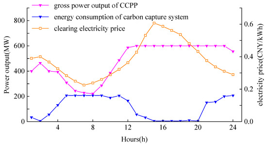 To further investigate the flexible operation mechanism of CCPP, an analysis of the power output and carbon flow is conducted. As shown in Figure 6, the net power output of a CCPP is the difference between its gross power output and the energy consumption of the carbon capture system. During low electricity price periods, it is observed that CCPP tend to increase the energy supply to carbon capture systems. This strategy is motivated by the opportunity to capture CO2 and obtain revenue by selling the excess carbon allowances in the carbon trading market.