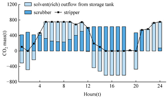 As indicated by Figure 7, the scrubber and stripper of the integrated flexible CCPP no longer operate synchronously due to the installation of the solvent storage tank. During low electricity price periods, as the output of the thermal power unit decreases, the amount of CO2 produced by the plant also decreases. Consequently, a carbon capture system, functioning as a dispatchable load to absorb excess electricity, may not have a sufficient supply of CO2 for capture during such periods. From hours 4 to 11, as depicted in Figure 7, there is a reduction in the volume of the “rich” solvent in the tank, as solvents from the scrubber and “rich” solvent tank are transferred to the stripper. This leads to a substantial increase in carbon capture energy consumption, leading to a significant reduction in the net power output of the CCPP.