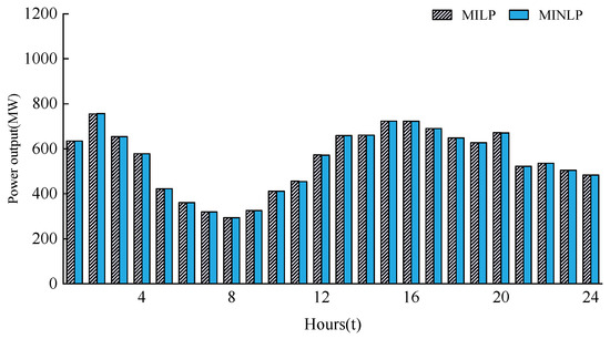 Table 3 compares the solution results of the MILP and MINLP models using the Gruobi optimizer. As shown in Table 3, compared to the MILP model, which was solved in 15.61 s, the MINLP solution was obtained in 1443.37 s. Regarding results accuracy, the MILP optimization results in an objective function value of 3438.9, while MINLP optimization yields a value of 3440.8, with a mere difference of 1.9 between the two. The difference between the two objective function values is rather small. As depicted in Figure 8, the optimal bidding electricity quantities in the day-ahead market obtained from MILP and MINLP are rather similar. In summary, based on the comparison of the exact optimal solution between the MILP and MINLP approaches, MILP can find acceptable exact solutions in our bidding problem much faster, demonstrating that the MILP approach holds advantages over the MINLP technique from the viewpoint of solution time.