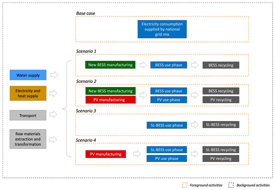 The large-scale production and usage of automotive batteries also presents a significant concern regarding environmental impacts, as the manufacturing, application, and recycling/disposal of batteries are also sources of pollution []. In particular, the battery manufacturing phase involves substantial energy consumption and emissions of pollutants, prompting research to explore the possibility of repurposing end-of-life automotive batteries in battery energy storage systems (BESSs) to mitigate the environmental impacts associated with battery production and enhance battery efficiency []. Indeed, secondary utilization has been proven beneficial across various environmental impact categories []. In recent years, numerous studies have directed their attention towards assessing the environmental sustainability of battery recycling, particularly with the increasing retirement of automotive batteries [,,,]. Factors such as cell chemistry, recycling efficiency, and the quality of recovered materials can significantly influence the environmental impact of various recycling methods [,,]. A direct comparison between the recycling of lithium iron phosphate (LFP) batteries and recycling after secondary utilization in BESSs revealed that incorporating LFP secondary utilization in BESSs effectively reduces fossil fuel consumption in the life cycle []. Thus, if over 50% of lithium-ion batteries were repurposed, significant environmental impacts could be mitigated. Finally, from a life cycle perspective, the operational phase of batteries entails considerable environmental impacts arising from the generation of the electricity required for their recharging [], which vary depending on the carbon footprint characteristic of the electricity mix being utilized. For example, in Europe, this mix ranges from 56 gCO2eq/kWh in France to 692 gCO2eq/kWh in Poland []. For this reason, numerous studies are investigating the integration of BESS with renewable energy generators, such as wind or photovoltaics (PVs) [,].