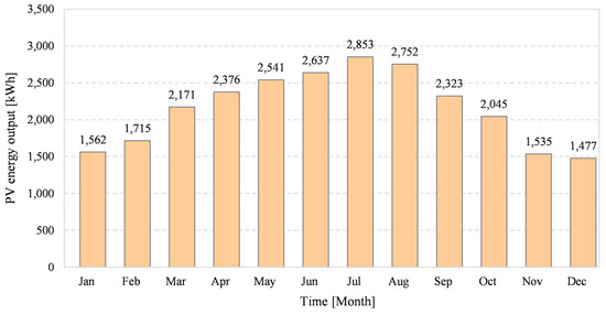 The use phase of the BESS and PV system is modeled according to data already presented by the authors in previous publications [,]. The BESS serves a ball mill machine used in a ceramic factory located in the industrial district of Civita Castellana in the Province of Viterbo (Central Italy). The monthly energy output for the PV system is simulated using the European Photovoltaic Geographical Information System (PVGIS) [] simulation tool (Figure 3), according to the latitude of the considered place and installed peak PV power.