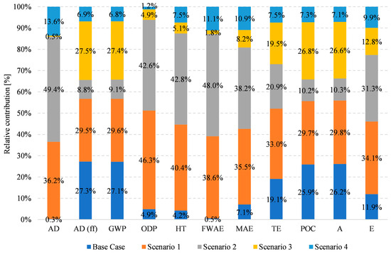 Figure 6 shows the comparative analysis among the scenarios for the GWP, AD, and HT indicators. Scenario 1 emerges as the most significant contributor to GWP, with a notably elevated value of 1.64 × 104 kg CO2 eq. Furthermore, Scenario 1 shows an increase in GWP by 8.61% with respect to the base case and presents the lowest impacts across the AD and HT indicators. On the other hand, Scenario 2 demonstrates the most substantial impact on both AD and HT, with values of 1.66 × 10−1 kg Sb eq and 4.09 × 103 kg 1,4-DB eq, respectively. In particular, Scenario 2 notably exhibits a substantial decrease in GWP, registering a reduction of approximately 66.52% relative to the base case. On the other hand, it exhibits the highest impacts in terms of AD and HT, primarily due to the manufacturing stages of BESS and PV. Moreover, Scenario 3 displays a marginal increase in GWP by approximately 0.66%, with moderate impacts on both AD and HT, registering rises of 44.86% and 20.05%, respectively. Finally, Scenario 4 similarly shows a significant decrease in GWP, reaching around −74.82%. Thus, as it is possible to note, the manufacturing stage of PV and batteries significantly contributes to abiotic depletion via the extraction of metals and minerals essential for their manufacture, entailing intensive mining activities and causing habitat degradation and soil erosion. Moreover, the transportation of materials and energy-intensive processes such as smelting are reliant on fossil fuels, amplifying the depletion of finite energy resources and GHGs. Furthermore, the disposal of chemicals and solvents for cleaning, coating, and other purposes during production leads to soil and water contamination, contributing to AD by disrupting natural ecosystems and contaminating resources. On the other hand, emissions and releases from manufacturing facilities can contribute to HT, posing risks to human health through pollutants and water contamination.
