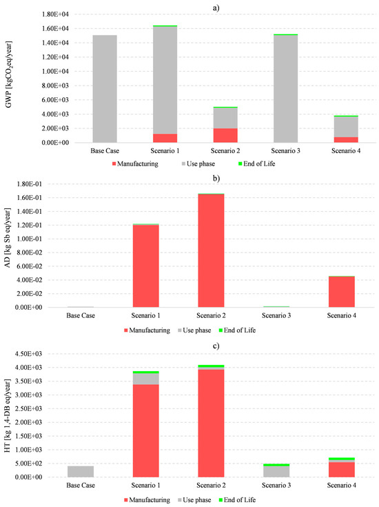Finally, GWP is chosen as the metric for comparison with the existing literature as it is commonly used in LCA studies. According to Figure 6a, in this study, the contribution to GWP is primarily due to the use phase, which directly depends on the electrical consumptions indicated in Table 3. Thus, the comparison is conducted with similar studies where GWP has been calculated based on the kWh of electricity consumed. Specifically, with electrical consumptions of 32,120 kWh/y, 32,120 kWh/y, 6135 kWh/y, 32,120 kWh/y, and 6135 kWh/y for the base case, Scenario 1, Scenario 2, Scenario 3, and Scenario 4, respectively, a GWP of 1.51 × 104 kgCO2 eq/y, 1.51 × 104 kgCO2 eq/y, 2.88 × 103 kgCO2 eq/y, 1.51 × 104 kgCO2 eq/y, and 2.88 × 103 kgCO2 eq/y is obtained, respectively. From these values, an average GWP value per kWh of electricity consumed is derived, amounting to 0.469 kgCO2 eq/kWh. This GWP value is consistent with the literature for the average European mix, such as 0.590 kgCO2 eq/kWh found in Ref. [] and 0.334 kgCO2 eq/kWh in Ref. [], and for the worldwide average of 0.475 kgCO2 eq/kWh in Ref. [].