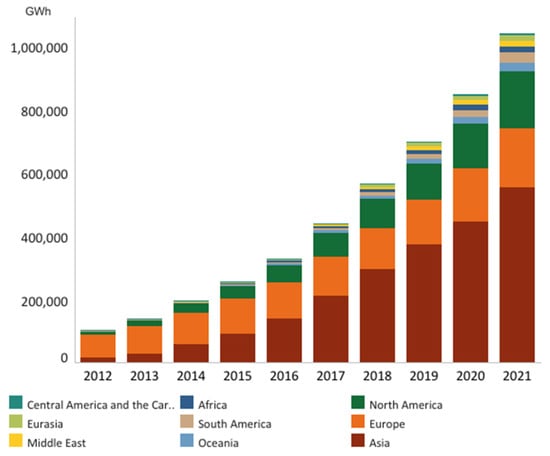 Among the several renewable energy sources, including hydropower, bioenergy, geothermal, and wind energy, solar energy, harnessed through photovoltaic (PV) technology, has emerged as a leading solution in renewable energy development [4]. Annually, the solar energy potential is approximately four million exajoules, positioning it as a superior energy alternative due to its abundance and reduced greenhouse gas emissions [5]. According to the International Renewable Energy Agency [6], photovoltaics rank as the second most installed renewable energy source, trailing only hydropower (excluding pumped storage). In 2022, the installed PV capacity reached 31.2%, marking a 3% increase from the previous year [6]. As depicted in Figure 1, electricity production via PV technology has been on an upward trajectory in every region, highlighting the growing public interest and the anticipated continual rise in demand. The versatility of PV technology, evident in its applications ranging from personal wearable devices to transportation and building systems, further fuels its demand [7].