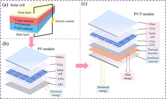 Typical structure of (a) solar cell, (b) photovoltaic module, and (c) photovoltaic–thermal module [8].
