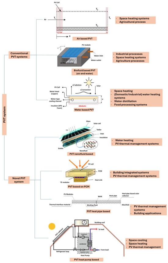 As discussed earlier, PVT technology aims to harvest excess waste heat from solar cells and mitigate overheating issues that diminish the electrical performance of PV systems. The evolution and research in PVT technology have led to a diverse range of solutions tailored to meet market demands and optimize performance. Noro et al. [37] categorized PVT systems based on the heat extraction medium, including air-, liquid-, heat pipe-, PCMs-, and thermoelectric-based systems. They noted that liquid-based PVT collectors are more efficient in terms of thermal performance, facilitating more uniform temperature distribution owing to the higher heat capacity and heat transfer coefficient of liquids compared to gases. Further expanding on classifications, Oh et al. [38] provided a broader categorization encompassing various systems based on the medium of heat extraction, type of heat extraction, solar input, system configuration, and the use of spectrum filters. Additionally, Figure 3 describes both conventional and novel PVT system techniques, along with their integration into various application areas [39,40,41,42,43,44,45,46].
