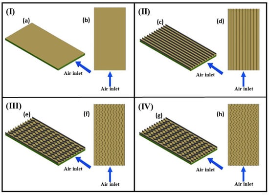 Schematic of photovoltaic–thermal air collector; (I) conventional photovoltaic–thermal; (II) linear fins; (III) zig-zag fins; (IV) wavy fins; (a), (c), (e), (g) isometric view; (b), (d), (f), (h) top view [77].