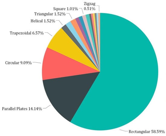 As previously discussed, the PVT system’s thermal absorber plays a crucial role in the heat transfer process. The diameter of the pipes in the system is particularly important; larger diameters tend to result in lower efficiency [80]. Consequently, smaller diameters are preferred to maximize the performance of the equipment. Tuckerman and Pease [81] suggested that liquid-cooled heat exchangers with microscopic dimensions could significantly enhance the heat transfer process. This has led to the global development of microchannel technology. Extensive research has been conducted to integrate mini/microchannels into PVT systems, supporting the advancement of renewable energy [82]. Figure 7 shows some of the mini/microchannel geometries that have been developed [83]. Table 2 summarizes notable studies on mini/microchannels [84,85,86,87,88,89,90,91].