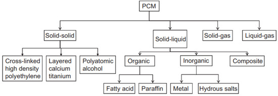 PCMs have been recognized as efficient latent energy storage materials since their introduction by Telkes and Raymond [113] in the 1940s. PCMs are highly effective in absorbing and releasing large amounts of heat within constant or narrow temperature ranges, making them suitable for various applications, including smart housing, waste heat recovery, and solar collectors. Various types of PCMs are classified as depicted in Figure 8 [114]. PCMs absorb sensible heat until they reach their melting/solidification temperature; at this point, they begin to absorb latent heat and continue melting, as illustrated in Figure 9 [115]. The mechanism of PCMs itself does not require any flowing medium to reject heat, it also means that in the PCMs system, external energy such as pumping power is not needed [116,117,118,119]. In recent years, researchers have focused on utilizing the unique heat rejection capabilities of PCMs in PVT systems, as summarized in Table 5 [120,121,122,123,124,125,126,127,128,129,130,131].