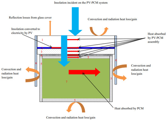 Schematic of combination photovoltaic–thermal and phase change material system: (1) glass cover; (2) photovoltaic cell; (3) photovoltaic back sheet; (4) layer of epoxy glue as an interface between photovoltaic and phase change material container; (5) phase change material container wall; (6) photovoltaic frame; and (7) phase change material layer [131].