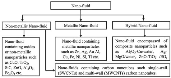 The use of nanofluids in modern PVT systems has become increasingly common because of their desirable characteristics, such as enhanced thermal conductivity and light absorption [132]. Research has demonstrated that employing nanofluids as coolant media in the thermal absorbers of PVT systems significantly improves performance by managing the high temperatures of solar cells [133,134,135]. The various types of nanofluids can be seen in Figure 12 [136]. Nanofluids play a crucial role in efficiently transferring heat from solid components to the flowing fluid. Thus, the selection of nanofluid type in a PVT system is vital to ensure compatibility and meet the desired performance criteria. Table 6 summarizes studies involving PVT systems with nanofluids as coolant media, featuring different types and configurations [54,137,138,139,140,141,142,143,144,145,146,147].