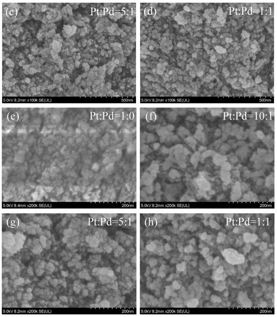 When a small amount of the Pd element is added (Pt/Pb = 10:1), the particles on the surface of the catalyst are more dispersed, the granularity is more obvious, and the pores are more adequate, with a better synergistic effect. With the increase in the added Pd content, the particles on the catalyst surface have a tendency to re-colonize and become larger.