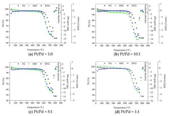 The TG curves, DTG curves, and DSC curves of the four catalyst ratios obtained from the experiments are shown in Figure 2, and the downward direction in the DSC curves is the exothermic direction. The maximum exothermic rates of each scheme are close to each other, among which the Pt/Pd = 5:1 scheme has the lowest maximum exothermic rate of 11.5 mW/mg and the Pt/Pd = 10:1 scheme had the highest maximum exothermic rate of 14.3 mW/mg.