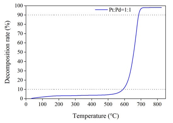 Figure 3 shows the conversion rate curve of carbon black with temperature change when Pt/Pd = 1:1 in the catalyst. From the curve, the decomposition rate between 0 and 10% is almost unchanged with the increase in temperature, the combustion rate is very slow, and the mass consumed at this time is the mass of other impurities such as water in the carbon black. After the decomposition rate rises to 10%, it rises rapidly with the temperature increase. After the decomposition rate reaches 90%, most of the carbon black is already consumed, so the rising trend becomes slower. To make the parameter analysis more reasonable, thermodynamic parameters such as the reaction activation energy (E) and pre-exponential factor (A) were calculated using data with conversion rates in the range of 10% to 90%.