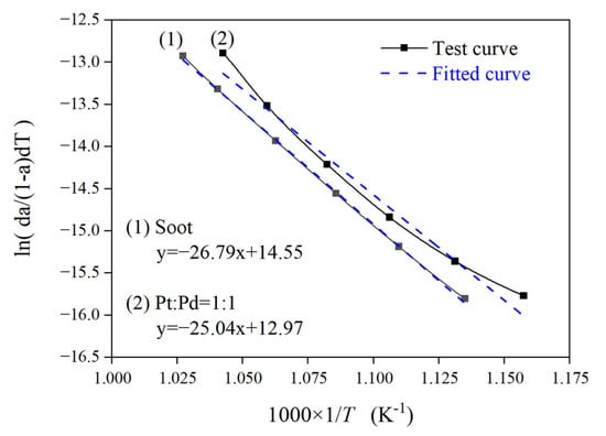 Figure 4 shows the curves processed and fitted to the experimental data using the Coats–Redfern integration method for the Pt/Pd = 1:1 scheme and the pure carbon smoke, while using the same method to process the data for the other experimental schemes to obtain the kinetic parameters for each experimental scheme, as shown in Table 3, where logarithmic treatment is taken for the pre-exponential factor.
