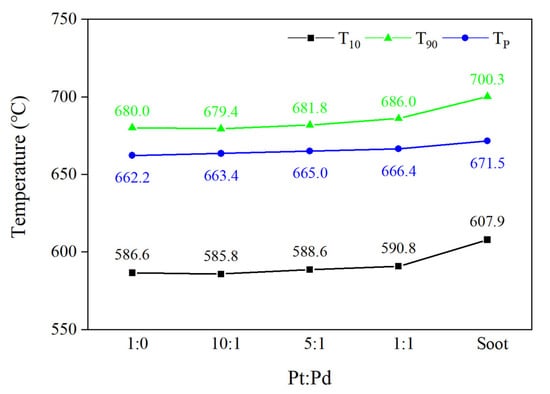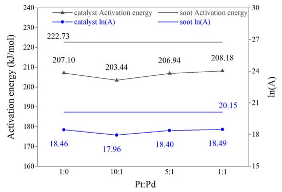 - When the ratio of Pt/Pd was 10:1, the specific surface area and the pore volume of the catalyst were the largest, and the activation energy of combustion and the pre-exponential factor of carbon soot particles were the smallest, which were 203.44 kJ/mol and 6.31 × 107, respectively, and were 19.29 kJ/mol and 4.95 × 108 lower than those of pure carbon soot. At the same time, the starting temperature of the soot, T10, and the final temperature of the carbon soot, T90, were the lowest, which were 585.8 °C and 679.4 °C, respectively: 22.1 °C and 20.9 °C lower those that of pure carbon smoke;