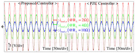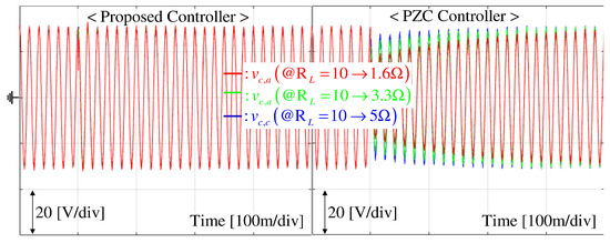 This section demonstrates the tracking performance variations for three resistive–inductive load pairs of (, H), (, H), and (, H) under the same settings as in Section 5.1.1. Comparing the output voltage responses in Figure 4, Figure 12 indicates the consistent output voltage responses by the proposed controller for resistive and resistive–inductive load operations, unlike the conventional PZC controller. The corresponding a-phase voltage responses are presented in Figure 13 with considerable rapidity and consistency, compared with the PZC controller.