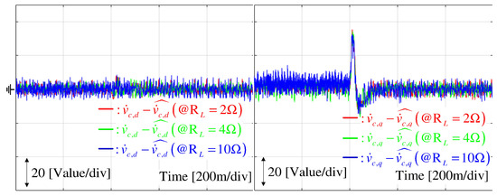 This section observes the tracking performance variations under the use of three resistive loads , 4, . The output voltage reference was suddenly increased from its initial value V to V. Figure 4 shows that there were no tracking performance variations under the proposed control, but they were present under the PZC control, in the absence of current feedback for the proposed control system. Moreover, the proposed self-tuner effectively improved the closed-loop performance in the transient periods by increasing and restoring the feedback gain (e.g., feedback-loop adaptation). This beneficial point comes from the observer, online self-tuner, active damping, and DOBs embedding in the proposed controller. The resultant a-phase voltage responses are depicted in Figure 5 with the consistent closed-loop performance with the proposed controller in the presence of operating condition changes. Figure 6 and Figure 7 show the d-q current responses to be driven more rapidly by the proposed controller than the PZC controller. The load current waveform for each controller is presented in Figure 8, resulting in the total harmonic distortion (THD) calculation result of (approximately the same with both controllers), which is acceptable for the actual applications. Figure 9 presents the observer error behaviors in this task with the successful state estimation results by rendering the estimation error to be convergent to zero by the proposed observer. The DOB and self-tuner responses are shown in Figure 10 and Figure 11.