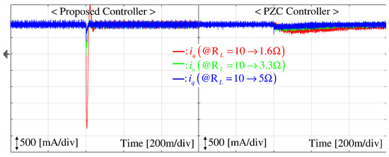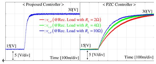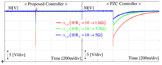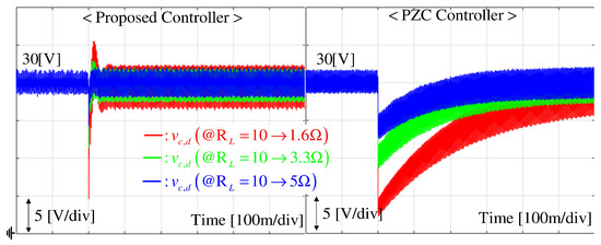 This section demonstrates the output voltage regulation performance improvement at the fixed 30 V operation mode with three sudden resistive load change scenarios from the initial resisitve load to , , and . Figure 14 depicts the regulation performances from the proposed and PZC controllers by showing the d-axis voltage responses. There were significant performance improvements rather than the tracking task under the three load variation scenarios with the considerable reduction of transient periods by the proposed controller. This improvement was also presented in a-phase voltage responses shown in Figure 15. Figure 16 and Figure 17 depict the d-q current whose rapid behaviors result in this output voltage’s regulation performance improvement.