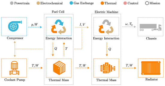 A typical example of how the models interact and send information between components is shown in Figure 1. A compressor provides pressurized air to the fuel cell. Internally, the fuel cell converts hydrogen and oxygen to electrical current and waste heat. The electrical current produced by the fuel cell is consumed in part by its balance of plant components, but mainly by the electric machine (EM), where it is converted to torque and additional waste heat. The torque from the electrical machine is finally converted to a force acting on the truck chassis, that overcomes the losses and builds up kinetic energy. The thermal masses of the fuel cell and electric machine are connected in series to the main coolant circuit.