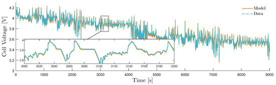 The core models of the electrochemical systems are the battery and the fuel cell. The battery cell currently implemented in the ECCV platform is a Panasonic 18650PF (Eindhoven, The Netherlands), with a nominal capacity of 2.9 Ah. The model is of equivalent circuit type, with five resistor-capacitor circuits in series that approximate a Warburg impedance [25]. The open circuit voltage model is a general functional form [26]. The parameter estimation and model validation were performed on openly distributed pulse-response, slow discharge, and drive-cycle data [27]. For each pulse test, the parameters are estimated by grey-box estimation methods from the Matlab System identification toolbox [28]. The model validation for 25 °C is shown in Figure 3. The experimental data [27] is an automotive drive cycle, appropriately scaled for a single cell, with current and voltage measurements. The figure shows model fit when the ambient temperature is 25 °C, from 100 to 30% stage of charge. The battery pack model is constructed by combining cells in series and parallel, and the DC converter is modeled as a constant efficiency transformer.