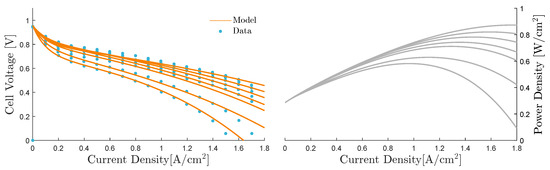 The left graph shows the fuel cell model fit to data [29]. The curves represent anode and cathode pressures evenly spaced between 1 and 3.5 bar. The figure shows that the model can capture variations in pressures and that the maximum power output can be controlled by these variations. The right graph shows the calculated power density.