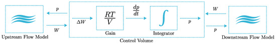 The air and fuel systems are modeled as ideal mixtures of hydrogen, oxygen, water, and nitrogen, where all components are tracked with their individual partial pressures as states in the gas model. Figure 5 shows the typical situation when working with the ECCV gas exchange models. The flow models use upstream and downstream pressures to calculate a flow, and the control volumes use the upstream and downstream flow to calculate pressure, using mass conservation and the ideal gas law.